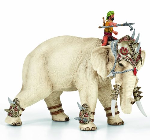 Schleich - 70063 - Figurine - Eléphant de Combat avec Cornac La taille imposante et le dangereux équipement de combat de l'animal intimident fortement ses adversaires. Le duo est complété par une installation qui contient deux héros supplémentaires. Ce gigantesque éléphant est équipé d'un dangereux attirail de guerre. Armé de piques de métal sur son crâne, ses défenses et ses pattes, il est prêt à la charge sur le champ de bataille. Son courageux guerrier porte une épée contre son dos et tient une lance à la main pour devancer tout éventuel Héro qui serait assez imprudent pour les attaquer.