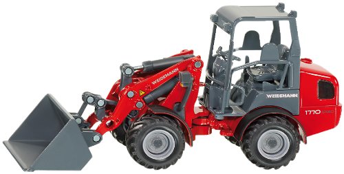 #SIKU Weidemann Hoftrac. Dieser kleine und wendige Radlader der Marke Weidemann gehört zur Standardausstattung mittlerer und größerer landwirtschaftlicher Betriebe. Durch das Knickgelenk meistert die Maschine auch enge Kurvenradien problemlos. Das realitätsnahe Arbeiten mit dem Modell ist möglich, da Ladearm und Schaufel durch Drehgelenke beweglich gestaltet wurden. Der offene Fahrerplatz ist, wie auch die gesamte im Maßstab 1:32 gehaltene Maschine, sehr detailliert gestaltet. Das weitgehend aus Metall gefertigte Modell rollt auf originalgetreuen Felgen mit grobstolligen Reifen aus gummiertem Material.